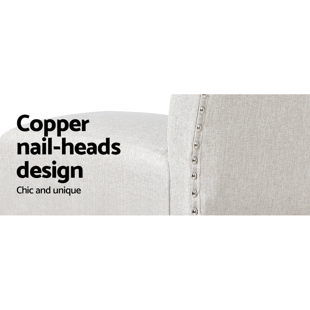 Nothing says elegance quite like an Artem Barstool from Artiss. The tufted button barstools upholstered in neutral, soft linen fabric add a touch of warmth to any stylish living space. The copper nail head trim design adds a unique metallic accent to your d茅cor. The chairs are comprised of a sturdy wooden structure, dense and comfortable padding, sinuous spring support and solid rubberwood legs for a stable, secure chair. A high backrest and built-in footrest keep you comfortable and relaxed while anti-slip floor pads protect your guests from slipping and your floors from scrapes and scratches. Looking for a new way to lighten up your kitchen or living area? Look no further than the Artem Barstool set from Artiss.