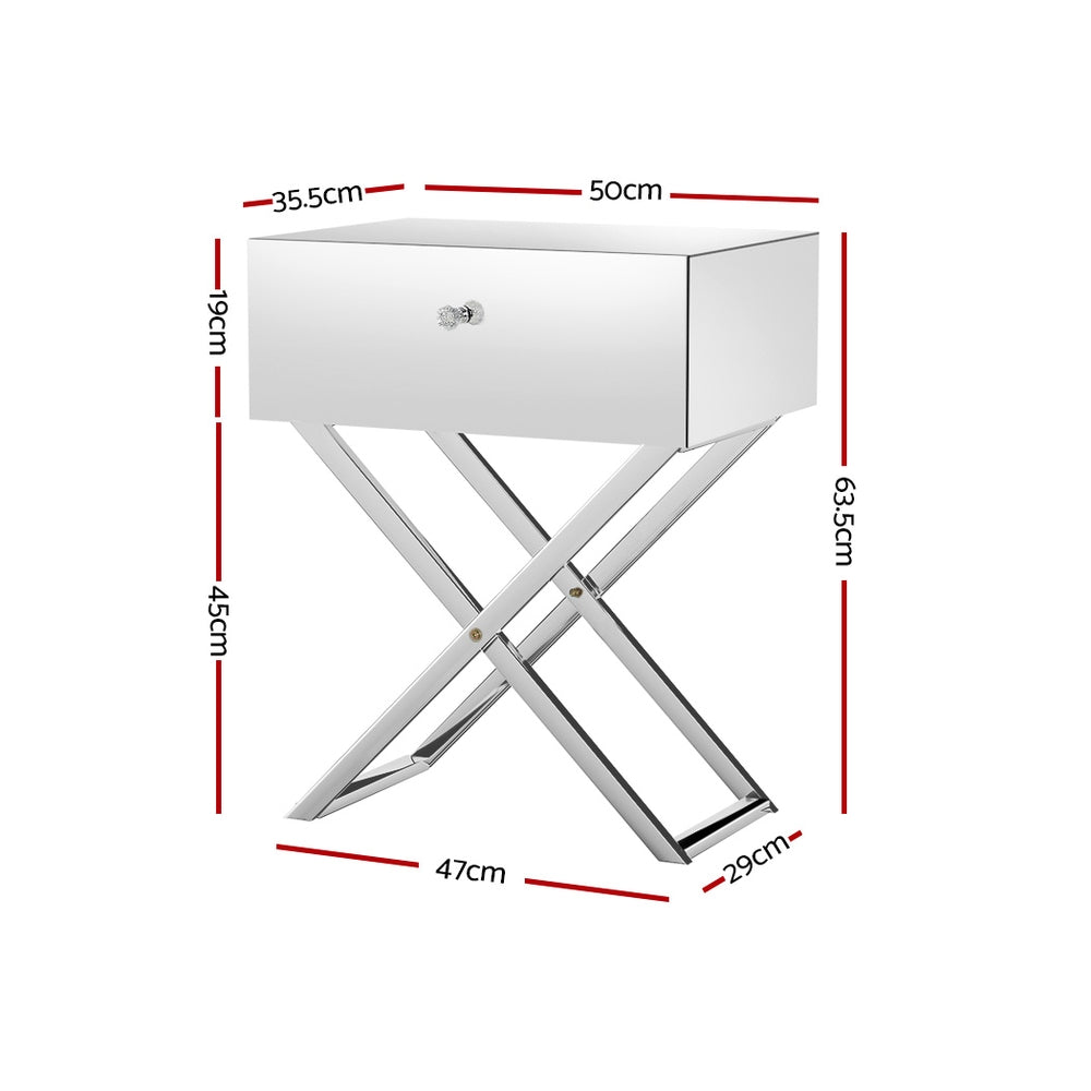 Many bedside tables look mundane and ordinary, but not our glamorous Artiss Moco Bedside Table. Crafted from solid MDF board with mirrored glass panels, our bedside table is incredibly durable and built to last. The stainless-steel cross-legged design is not only uniquely stylish but provides additional support. The generous-sized storage drawer is fronted by a gorgeous crystal drawer knob and opens smoothly to ample space for your bedside essentials. The generous tabletop has a weight capacity of 20kg for your favourite books, d茅cor or other trinkets. Of course, our bedside table need not be confined to your bedside. It also sits well next to your favourite armchair or at any end of your lounge set. Easy to assemble and even easier to maintain, the Artiss Moco Bedside Table is the perfect addition to any bedroom.