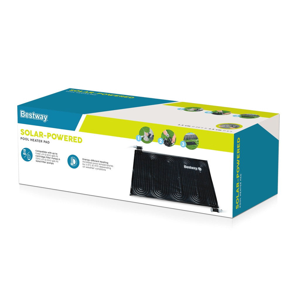 Warm your pool the natural way with this Bestway Solar Heater Pad! The 110cm x 171cm panel boosts water temperature by 3-5掳C using free solar energy. Easy to install with included 32mm & 38mm adapters - simply connect to your filter system (works with cartridge pumps maximum 9,462L/h and sand pumps maximum 8,327L/h). Durable construction handles Aussie weather conditions. Multiple units can be joined for larger pools. No electricity needed - just let the sun do the work! Enjoy warmer swims for longer this season.