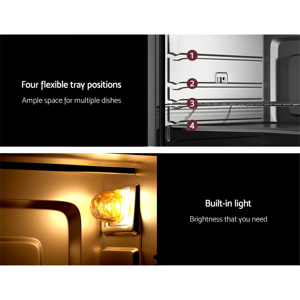 Need a multi-functional oven that you can take anywhere? Or do you need a solution for a home without an existing oven? Look no further than the Devanti Convection Oven. Portable and easy to use, the 60L capacity oven can bake, grill and roast to create your favourite recipes with minimum hassle. The oven is well insulated and has a cool-touch handle to always keep heat and radiation at bay for comfortable cooking. It features a rotisserie option for even cooking, 4 flexible tray positions and your choice of heating element options for precise cooking control every time. With its tempered glass door and built-in light, you can always monitor the progress of your cooking and adjust the temperature as needed. It also has a 60-minute timer with an alarm to help you time your cooking to perfection. Not least, the oven also comes with a host of bonus accessories that include a non-stick baking tray, wire rack, tray handle, rotisserie fork and rack, so you'll have everything you need to start cooking pronto!