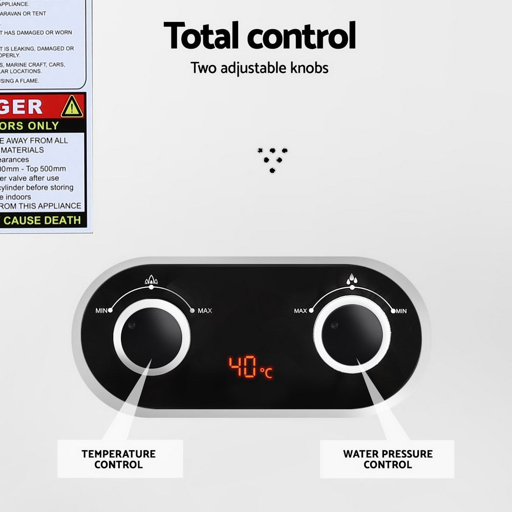 Experience the luxury of a warm shower in the great outdoors with the Devanti Gas Water Heater. This versatile and efficient outdoor showering solution offers convenience, clearly displayed on its LED screen. Safety is paramount, with a built-in processor limiting the maximum water temperature to 60掳C, to help preventing any accidents. The showerhead features an automatic on/off trigger for easy operation, while a variety of additional safety features ensure worry-free use. Designed for portability and ease of use, the Devanti Gas Water Heater comes equipped with a handy carry handle and all necessary mounting brackets for quick and hassle-free setup. Its lightweight construction makes it ideal for camping trips, beach outings, or any outdoor adventure where a warm shower is desired. With both winter and summer settings and adjustable water flow this LPG-powered heater offers a perfect blend of comfort and practicality for outdoor enthusiasts. Enjoy the freedom of the open country without sacrificing the comfort of a warm shower 鈥�the Devanti Gas Water Heater is your perfect outdoor companion.
