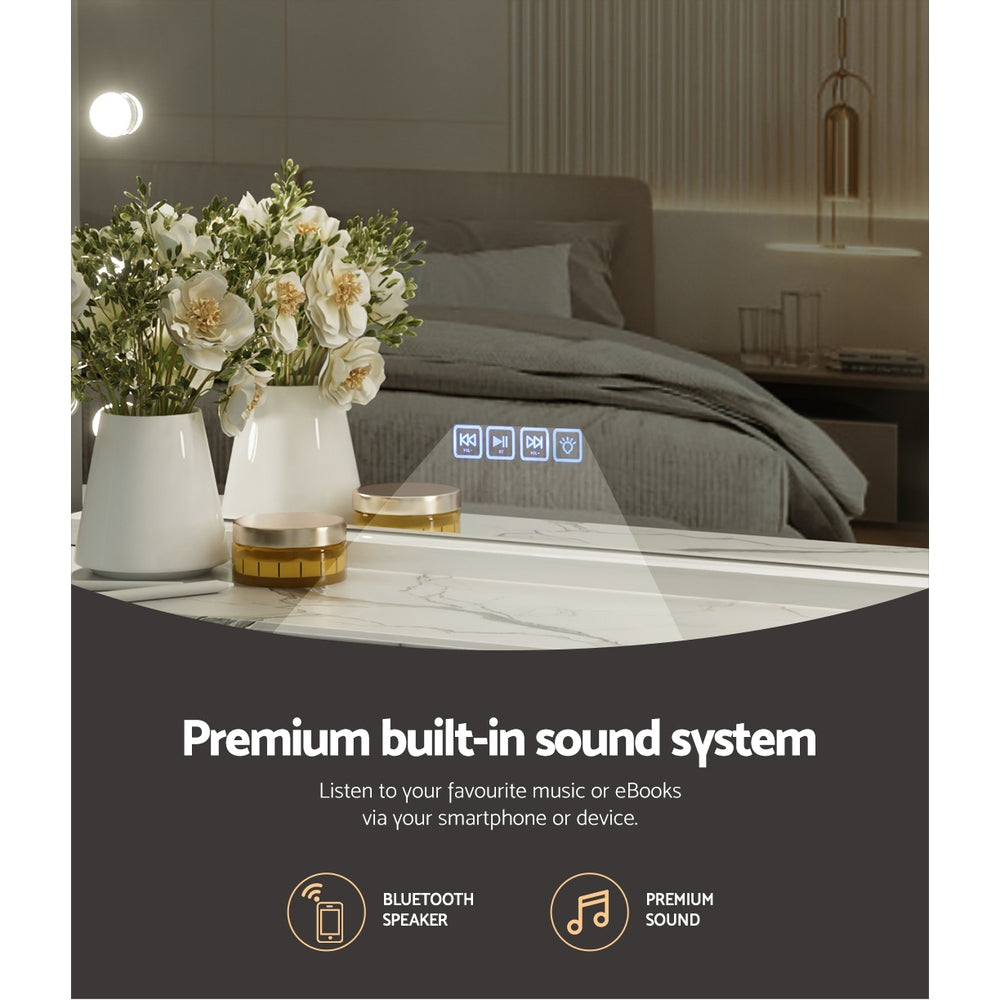 Get the star treatment with our gorgeous Embellir Make-up Mirror. Framed with 15 LED bulbs, this mirror really lights up your visage through your daily makeup regimen. The aluminium frame is sturdy, lightweight, and adds a touch of glamour to the entire mirror. The frame sits on an equally smooth powder-coated MDF base for stability and durability. Best of all, the built in Bluetooth speaker allows you to listen to your favourite audiobooks, music and podcasts as you go. Even more wonderful is that the LED light can be easily adjusted for brightness and colour temperature using our intelligent touch controls. Turn your bedroom or bathroom into a celebrity set overnight with our Embiller Make-up Mirror, and enjoy beauty in all its illuminated brilliance.