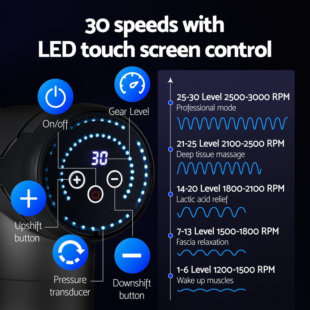 Whether you're a hard-core gym junkie, a dedicated office worker or recovering from an injury, you'll find relief with an Everfit Massage Gun. With a powerful high-torque brushless motor, the massage gun allows for high-frequency vibration at 1200-3000 strokes per minute and penetrates deeply for muscle relaxation from the comfort of home. The massage gun uses long-lasting and efficient rechargeable lithium batteries that allow the gun to run for up to 2 hours. There are 30 speed levels to suit various purposes; from simply waking up your muscles to relieving lactic acid and assisting muscle recovery after exercising, or even intense professional-level massages. The non-slip rubber handle provides a comfortable grip to reduce hand fatigue, and the device operates quietly for a comfortable massage experience. The smart touch LED display makes it easy to customize your massage experience. With six unique head attachments, the Everfit Massage Gun can help you dissipate fatigue, relax your muscles and relieve neck and back pain. Gets yours today and continue your fitness journey in comfort.