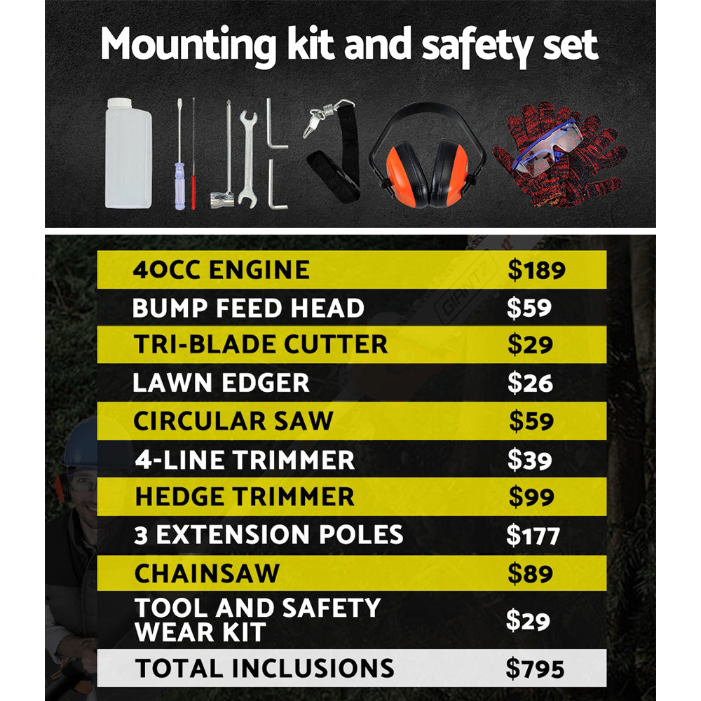 Giantz 40CC Pole Chainsaw Hedge Trimmer Brush Cutter Whipper Saw 4-Stroke 9-in-1