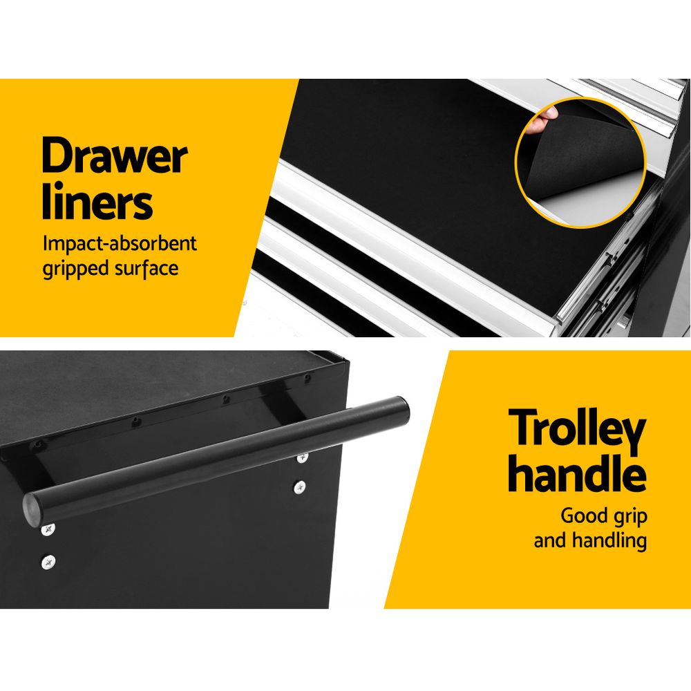 This robust, multi-drawer Giantz Tool Trolley is an essential for any workshop. Crafted from durable steel, it features smooth ball-bearing slides for easy access and a secure lock system for safety. Its spacious design includes varying drawer sizes to accommodate tools of all shapes, complete with non-slip liners. The chest is also mounted on omni-directional castors with locakble front wheels, ensuring a smooth maneuverability and stable positioning. Sleek and functional, it's perfect for organizing and protecting your valuable tools.