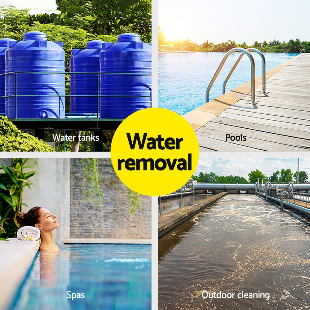 Empty pools, ponds, spas or flooded areas with a Giantz Submersible pump. Submersible pumps are perfect for a variety of situations, from setting up a home irrigation system to quickly draining ponds, tanks, pools or flooded areas. The motor runs quietly and efficiently, and it can be submerged to a depth of seven metres. The pump can operate automatically between 6-15cm of water and it an expel up to 7000 litres of water per hour. It is designed to work with dirty water, with a maximum solid passage of 3mm, so you can work in areas with muddy, sandy, or otherwise contaminated water. Finally, work anywhere thanks to its portable design that includes a 10m cable with a standard AU plug.