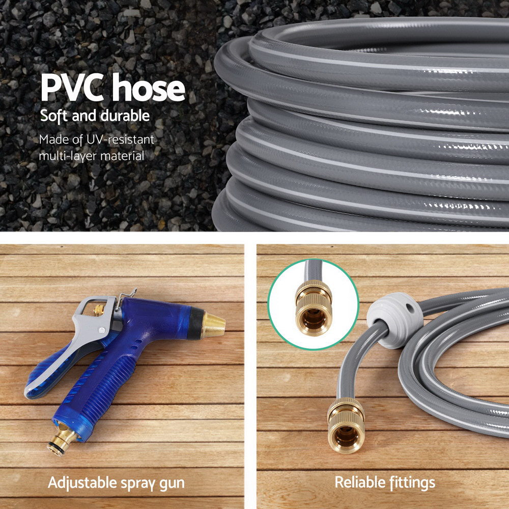 With a 180掳 swivel wall mount, PVC hose, and a built-in handle for portability, this reel is both practical and versatile. The adjustable multimode spray gun and durable fittings make watering tasks effortless, whether you're tending to plants or cleaning surfaces. Compact and user-friendly, it's a must-have for maintaining an organised and efficient outdoor space.