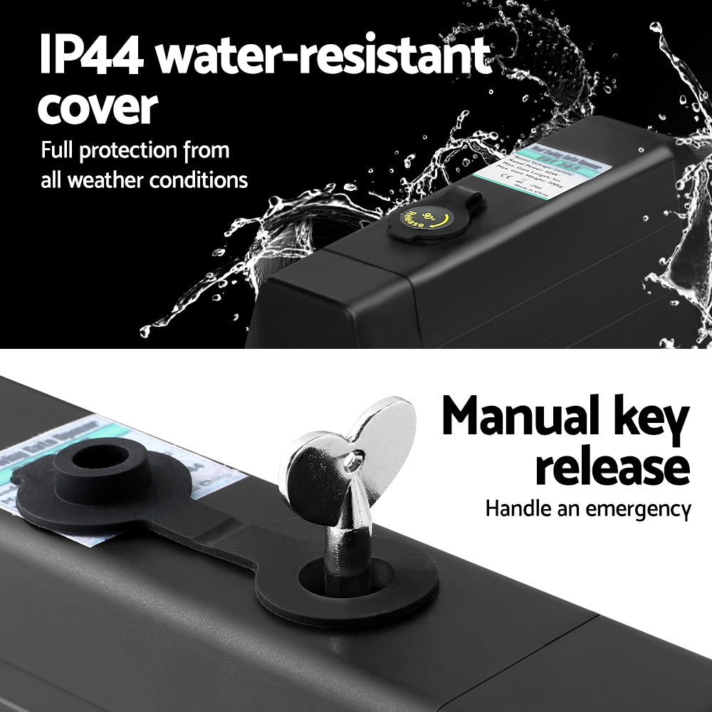 Ditch the manual gate duty with this secure and convenient solar-powered automatic gate opener. This system can handle heavy gates up to 10 meters long and weighing 600kg. It operates smoothly with gentle start and stop features, and prioritises safety with automatic stop or reverse if it detects an obstruction. No worries about power outages either, as an emergency release key allows manual gate operation. For added convenience, you can program the auto-close feature between 0-99 seconds. The weather and dust resistant control box ensures reliable operation, and two programmable remote controls come included. This versatile system works with various gate types, from steel and wood to vinyl, in panel, tube, or even chain-link styles.