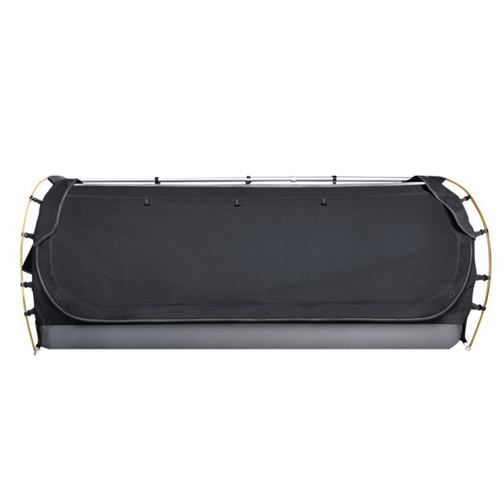 A 14oz 400gsm water-repellent Rip stop canvas cover, 500gsm PVC flooring and an extra 10cm high edge all round. Swagspeak for the ultimate tear-resistant waterproofing. Fully enclosed for privacy with zipped openings for fresh air anytime. Mesh panels to keep insects out.Thick aluminium support poles to hold up the entire set up.